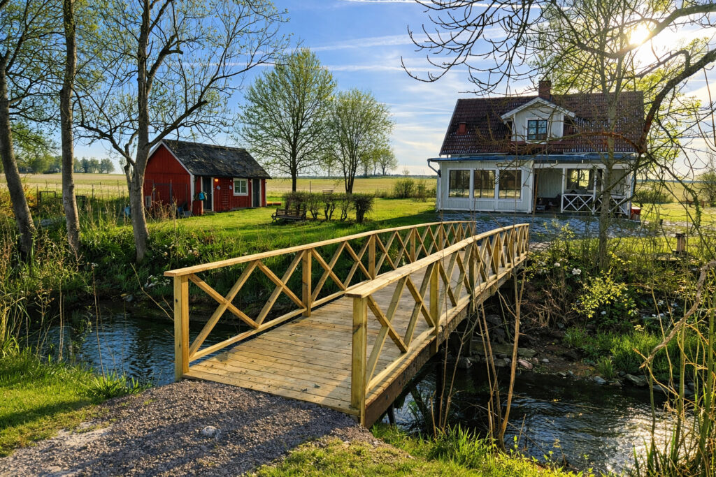 Vid huset rinner en å, och över ån går en liten bro som leder över till gården vi hyr av. När vi flyttade ut ville vår minsta son, som fortfarande bor hemma, ha det lilla uthuset som sitt eget – en plats där han kunde ha något eget.